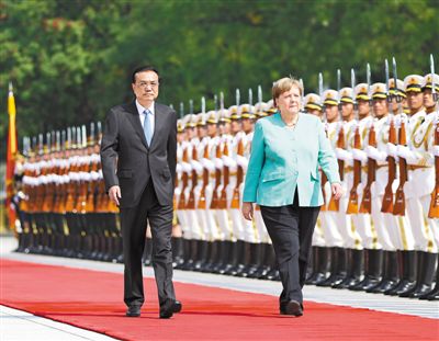 9月6日,国务院总理李克强在北京人民大会堂同来华进行正式访问的德国总理默克尔举行会谈。这是会谈前,李克强在人民大会堂东门外广场为默克尔举行欢迎仪式。