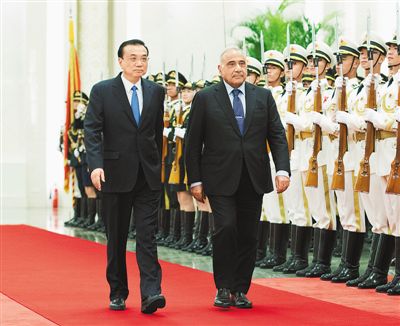 9月23日,国务院总理李克强在北京人民大会堂同来华进行正式访问的伊拉克总理阿卜杜勒—迈赫迪举行会谈。这是会谈前,李克强在人民大会堂北大厅为阿卜杜勒—迈赫迪举行欢迎仪式。