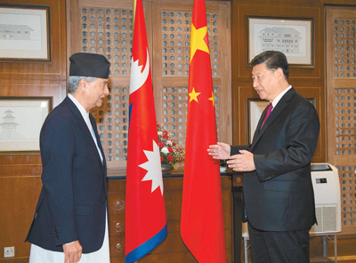 国家主席习近平12日在加德满都下榻饭店会见尼泊尔大会党主席德乌帕。