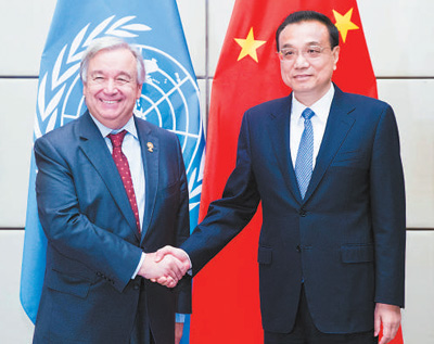 李克强表示,当前国际形势错综复杂变化,中国作为联合国安理会常任理事国,将继续坚定维护多边主义,维护以联合国为核心的国际体系,维护以国际法为基础的国际秩序。中方愿深化同联合国的合作,支持秘书长先生的工作,同各方一道落实好2030年可持续发展议程。在应对气候变化问题上,中国将承担作为发展中国家应尽的国际责任和义务,遵循共同但有区别的责任原则,同国际社会一道全面有效落实《巴黎协定》,促进绿色、低碳和可持续发展。