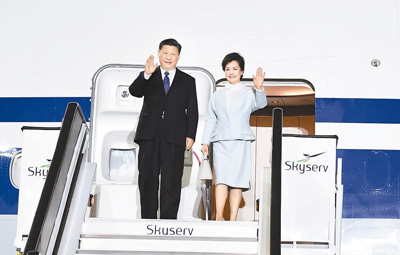 当地时间11月10日晚,国家主席习近平乘专机抵达雅典国际机场,开始对希腊共和国进行国事访问。这是习近平和夫人彭丽媛步出专机舱门。