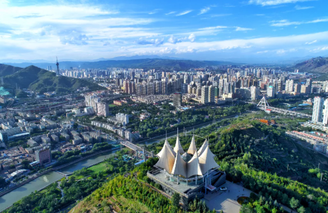 从西宁市南山公园远眺,蓝天下整座城市郁郁葱葱。