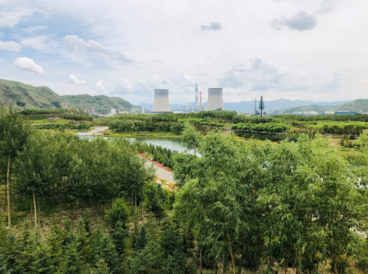 西宁市园博园内的电厂冷却塔与绿地交织成景。