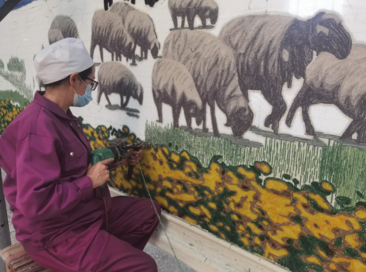 青海圣源地毯的工人在制作手工枪刺地毯。
