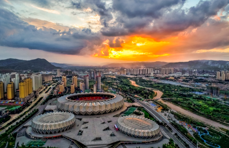 夕阳下,西宁市海湖新区体育馆航拍图。