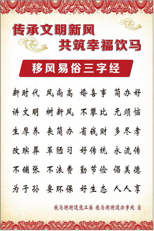 多样式宣传引导。街道新时代文明实践所(站)充分发挥载体作用,制作移风易俗创意宣传展板、喷绘、横幅,通过“幸福饮马”微信公众号、微信群等形式开展多元宣传。结合街道实际制定移风易俗“三字经”、移风易俗“十提倡十抵制”等内容,用通俗易懂的语言大力弘扬新人新事新风尚,揭示落后陋习、铺张浪费等反面典型,为移风易俗的顺利推进创造良好舆论环境。新时代文明实践所(站)通过道德讲堂,组织党员群众开展经常性宣讲、举办先进典型报告会,组织文艺宣传队、广场舞队开展移风易俗宣传,对少数思想落后群众开展面对面教育,引导辖区群众弘扬正能量,积极向善向上向美。