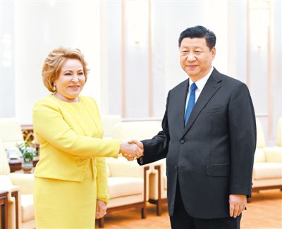 国家主席习近平4日在人民大会堂会见俄罗斯联邦委员会主席马特维延科。