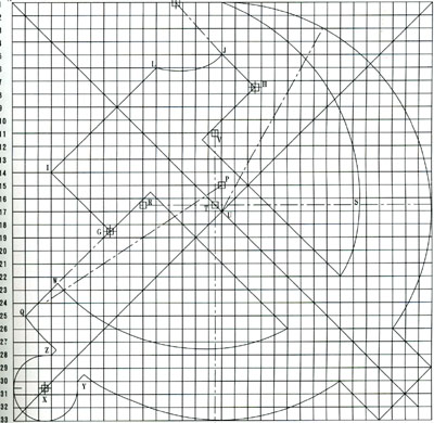 3 镰刀的画法:以M点(17、17′)为圆心、MN(N点为17、1′)为半径画弧⌒NO(O点为17、33′);以P点(17、15′)为圆心、PO为半径画弧,与HG的延长线交于Q点;以R点(1116′、17′中点)为圆心、RN为半径画弧,与通过R点的水平线交于S点;以T点(16、1716′、17′的中点)为圆心、TS为半径画弧,与通过T点的垂直线交于U点;以V点(16、1711′中点)为圆心、VU为半径画弧,与HG的延长线交于W,构成镰刀。以X点(3、430′、31′的中点)为圆心作圆与AB、BC线相切,从Y点(6、30′)、Z点(4、28′)分别作直线平行于BD,构成镰刀把。