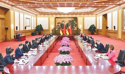 默茨表示,很高兴在中国农历马年春节之际,携重量级企业家代表团访华,这充分表明德方对深化德中经贸关系的高度重视和期待。德中两国相距遥远,但经济联系紧密,合作潜力巨大。德方愿本着坦诚开放精神,同中方加强高层交往,保持各领域常态化对话,推动双边经贸关系均衡、持续发展,促进绿色转型、应对气候变化等领域合作。德方愿同中方加强沟通协调,共同倡导多边主义和自由贸易。德方愿为推进欧中关系发展发挥积极作用。